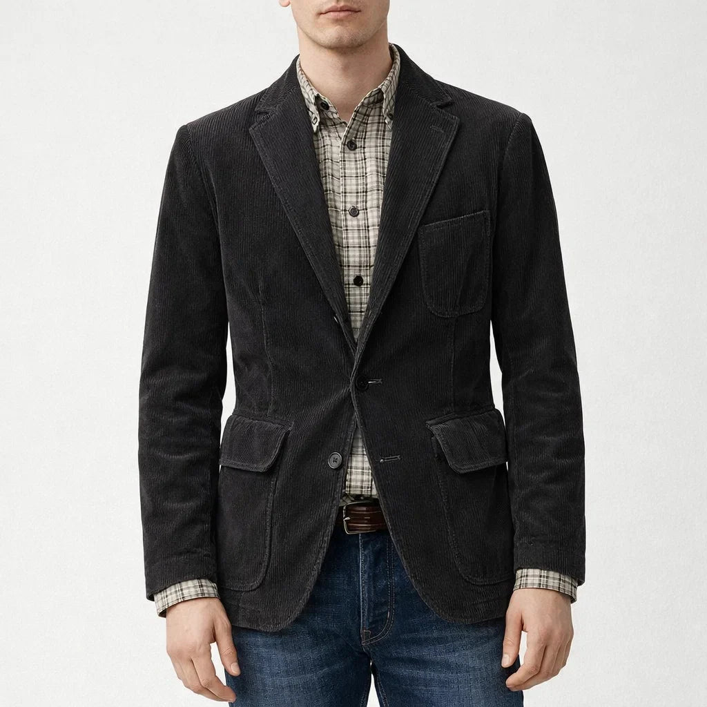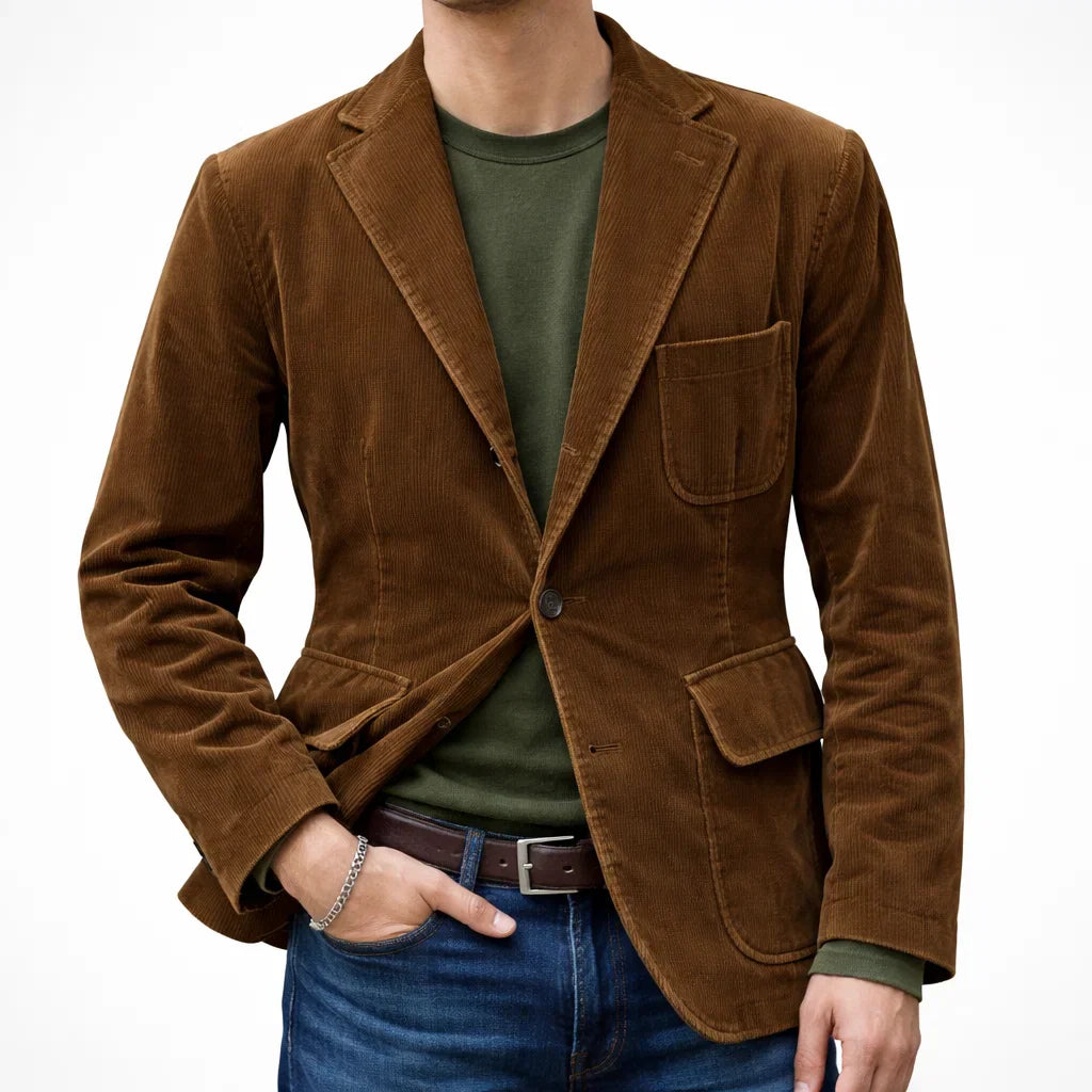 This cord blazer and matching vest set offers a relaxed fit that’s perfect for everyday wear.