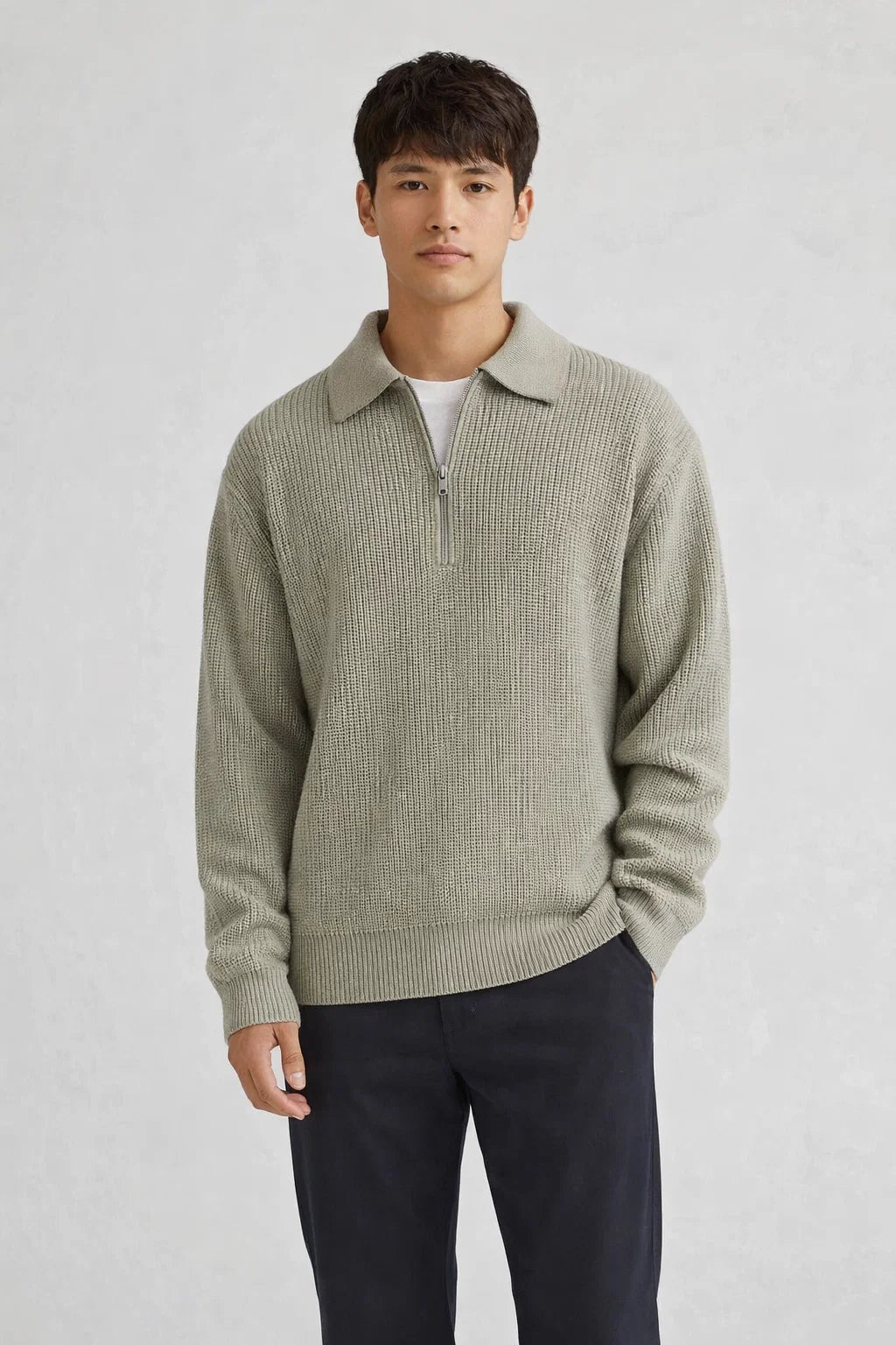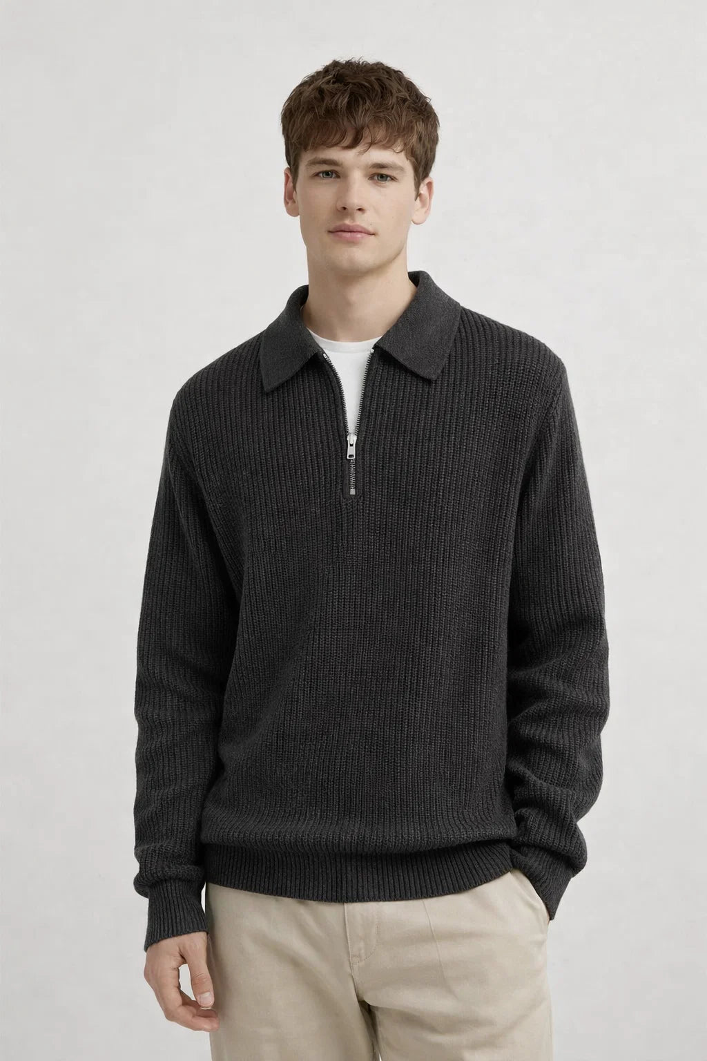 This quarter-zip jacket, made from luxurious jacquard knit fabric, seamlessly combines comfort with a sophisticated look.