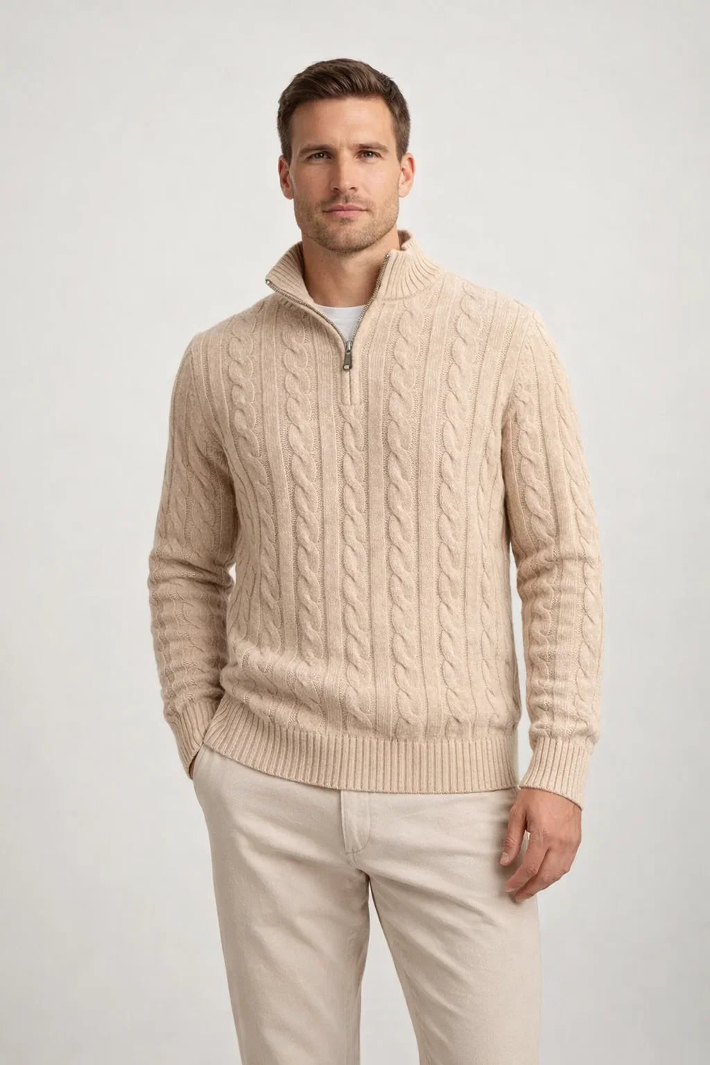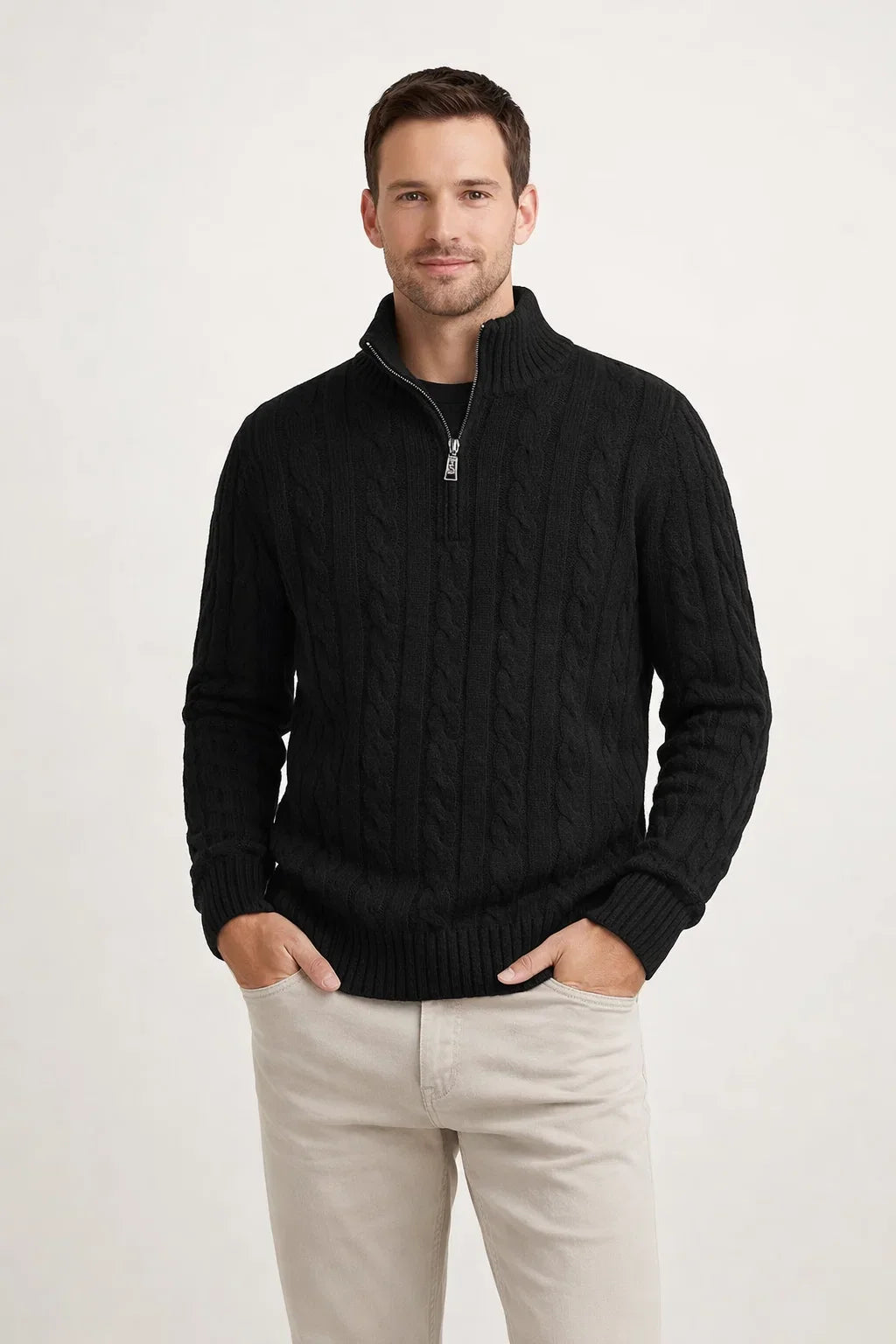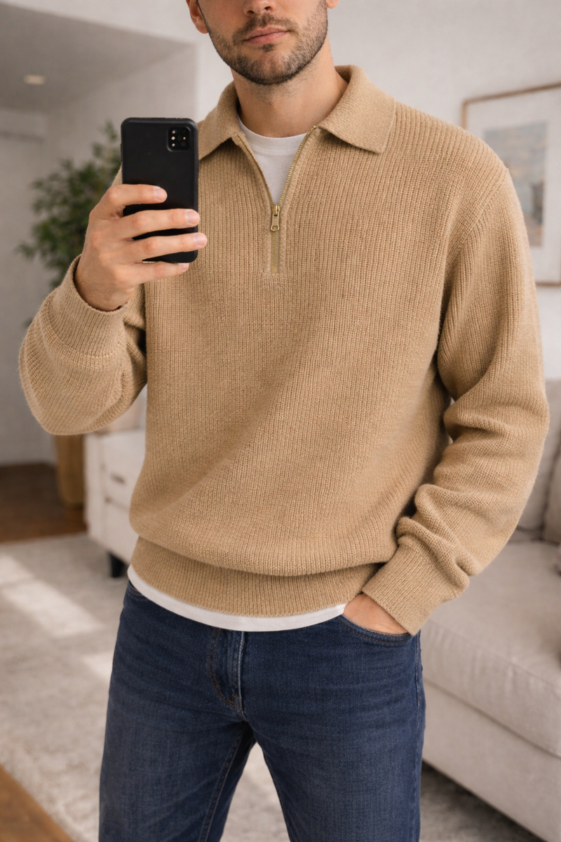 This knitted pullover combines a modern half-zip with a stand-up collar for ultimate comfort.